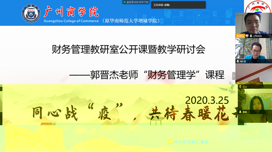 課後,财務管理教研室通過騰訊會議平台進行教學研讨會,參會老師對郭晉傑老師的本次公開課一緻高度好評,認為:郭晉傑老師教學基本功紮實,教學内容豐富和具有啟發思考,課堂教學節奏把握精準,知識點通過圖形表達生動和精确,化繁為簡,突出應用型人才培養目标。研讨會上,老師們積極分享在線教學經驗,包括師生溝通、作業布置、課堂互動和監控等方面。這些經驗有助于進一步完善線上教學工作以及當前的優秀課程建設。