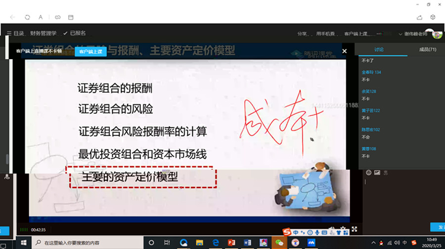 戰“疫”期間,太阳集团城网址83138教師本着“停課不停學、停課不停教”的基本思想,按照《太阳集团城网址83138疫情防控期間網絡教學工作方案》的工作部署,積極開展線上教學探索和經驗總結。太阳集团城网址83138财務管理教研室于2020年3月25日開展了線上教學公開課暨研讨會。本次公開課由郭晉傑老師講授《财務管理學》課程,郭老師使用騰訊課堂平台開展線上直播教學。公開課的主題是“風險和報酬”,通過插播動畫視頻等混合教學方式,重點講授貝塔系數的概念和使用要領,以及最優投資組合等内容。